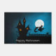 una bruja volando sobre su palo de escoba pasando la luna llena con una casa oscura en el fondo y un gato en la valla 100% Personalización. Haga clic en el botón PERSONALIZAR para agregar, mover, eliminar, cambiar el tamaño o cambiar cualquiera de los tipos de letra o gráficos.