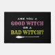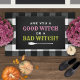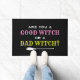 Este divertido felpudo de Halloween muestra la cita "¿Eres una buena bruja o una mala bruja?" diseño de tipografía con colores verde blanco, rosa y amarillo con acento de bastón de bruja.