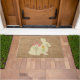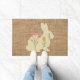 Doormat con la silueta de color claro de un conejito de Pascua con flores primaverales en el fondo de la mirada de burrega . Ideal en cualquier casa para una decoración rústica primaveral. Diseño de Alma Wad .
