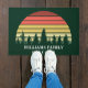 Doormat de cabaña de troncos de Guay en verde bosque para una casa de campamento o de bosque. La decoración de esta casa personalizado incluye una hermosa puesta de sol de época sobre un bosque de bonitos bajo su texto personalizado.