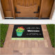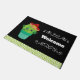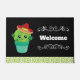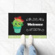Una alfombra de bienvenida con un bonito ilustracion de un plump y un cactus verde redondo, con grandes ojos kawaii, sonriente y con sombrero rojo. Parado dentro de una maceta de flores. La bienvenida está escrita entre dos separadores decorativos de estilo vintage. Un patrón de movimientos de color verde cal a lo largo del borde inferior.