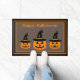 Una bella y linda linterna de Halloween Jack-o' y sonriente tallando tres calabazas con gorras naranjas negros de Witch con escritura feliz de Halloween y borde naranja sobre la alfombra de fondo negro y marrón de la puerta. Puede cambiar el texto y el color haciendo clic en las opciones de personalización.