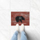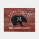 El regalo casero de madera rústico lindo, personalizado de la decoración para los rvers, los viajeros jubilados, los caminantes, los campistas, los amantes del oso o del animal, y los tipos outdoorsy es éste el doormat que acampa personalizado que lee los campistas contentos en letras curvadas mirada manuscritas, garrapateadas sobre una silueta del oso negro con una inicial con monograma en el centro. Añada el apellido en la parte inferior en fuente caprichosa. Contra un fondo del granero rústico viejo la madera pintó rojo oscuro tradicional. Gran regalo del retiro, también. Correcto en casa delante de rv, de una casa de verano o de una cabaña de madera rústica en las maderas.