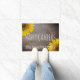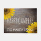 El regalo casero floral rústico de la decoración del país para los rvers, los viajeros jubilados, los jardineros, los caminantes, los campistas, y los amantes de naturaleza es este doormat de madera personalizado de la textura que lee los "campistas contentos en letras simples con una plantilla para añadir apellido abajo en las letras blancas, caprichosas. Contra una foto del fondo de la madera rústica, apenada que se marca con una cicatriz y se oscurece alrededor de los bordes. Los girasoles amarillos del país adornan enfrente de esquinas. Regalo bonito del retiro, también, y decoración floral del otoño. Correcto en casa delante de rv o de una cabaña de madera acogedora.