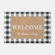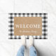 Alfombra de bienvenida diseñada especialmente con un diseño moderno de estilo casa de campo a cuadros búfalo en blanco y negro con el nombre de familia personalizado.