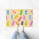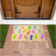 Una alfombra de bienvenida personalizado con una estampada de sandalias de chanclas coloridas y adornadas con diferentes colores sobre un fondo de arena. Agrega texto si lo deseas. Hace la alfombra de bienvenida perfecta para una casa de playa o regalo para alguien que ama sus chancletas.
