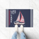 Doormat de casa de lago único personalizado con el nombre de su familia y decorado con un velero con velas rojas, rayas y el dicho "La vida es mejor en el lago". La plantilla facilita el escribir su nombre, un nombre de barco u otro texto. Este diseño se ajustó para un doormat de tamaño medio (24x36 pulgadas). Para una más pequeña, por favor visite esta página: https://www.zazzle.com/nautical_boat_navy_blue_life_is_better_at_the_lake_doormat-256844354864143485 ¡Gracias!