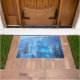 Doormat de un mágico castillo hecho enteramente de hielo. Una cascada congelada desciende de los cimientos de la mansión para convertirse en músculos al final. Pinos flanquean el castillo mientras el Sol se refracta a través del hielo creando hermosas luces azules que parecen venir del corazón de la mansión... tal vez los sueños congelados tratando de liberarse. La imagen se generó con Leonardo.ai y fue alterada por mí.