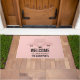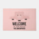 Una alfombra de bienvenida que dice: Bienvenidos a nuestra pocilga, personalizada con su apellido. Diseñado con un dibujo de la cara de un lindo cerdo rosado. Llevando una corbata negra. Levantado por sus pezuñas negras y mirando sobre una mesa. Dibujo tierno y caprichoso. Envuelto en un fondo rosado con algunos corazones desvanecidos aquí y allá.