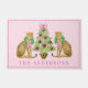 This Christmas gift bag has two Leopards wearing wreaths with a pink bow on either side of a Christmas Tree. The background is a light pink.