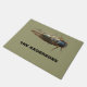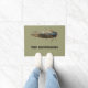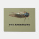 Bienvenidos invitados o tal vez asustarlos con este felpudo que muestra una foto gigante de una cigarra de ojos rojos. Debajo del fallo hay un espacio para agregar un nombre u otro mensaje con letras negras en negrita. La foto y el texto están colocados sobre un fondo de color verde oliva.