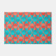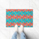 Este doormat tiene un diseño art deco de círculos naranjas y verde azulados de dos tonalidades dentro de triángulos verde azulados y naranjas de dos tonalidades.