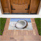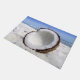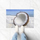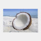 Esta alfombra de puerta tiene una fresca imagen de un coco en una playa.