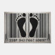 Un portero con un código de barras y dos huellas negras en el centro. El doormat tiene un mensaje humorístico que dice Escanear sus pies antes de entrar. Bienvenido a tus seres queridos con este estilo - Divertido diseño de código de barras - Escanea tus pies antes de entrar en Doormat.