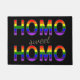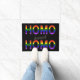 Doormat dulce y divertido para la persona o los pares abiertos y orgullosos. Texto intrépido y decorativo "HOMO dulce del HOMO", una palabra por línea. Las mayúsculas de las primeras y pasadas demostraciones llenaron del símbolo gay, la bandera del arco iris. El "dulce centrado" es levemente anguloso y puede ser color ajustado.