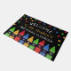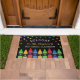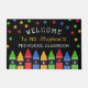 Alfombra de bienvenida para un aula personalizada con el nombre del profesor bajo estrellas coloridas y encima de una hilera de lápices de colores rojo, verde, azul y amarillo. Estera de puerta de jardín de infancia con lápices de colores y estrellas en un fondo negro. Bienvenido a la alfombra de la puerta de la escuela personalizada con el nombre del profesor en un juguetón amarillo.