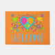 Un felpudo colorido del estilo pacifista del hippy que ofrece el signo de la paz colorido del corazón con el ilustracion de las palomas contra un fondo coloreado adaptable terroso con el signo positivo. Un acogedor, años 60 coloridos y estera de puerta agradable de los arty perfecta para su casa.