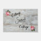 Esta manta de la puerta de la cabaña presenta el texto Cottage Sweet Cottage sobre un falso fondo de madera blanqueado con rosas rosadas bonitos. Perfecto para su decoración de cabaña o de época.