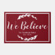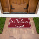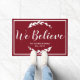 ¡Navidades rústicos de una granja se unen a una granja familiar! Siluetas de laurel blanco crepitantes rodean las palabras "Creemos" en un guión elegante en un audaz fondo rojo festivo. ¡Este felpudo también haría un gran regalo para recién casados o nuevos propietarios de casas!