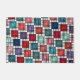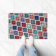 Este doormat tiene un diseño art deco de cuadrados hechos de ángulos superpuestos en tonos retro de azul y rosa.