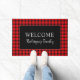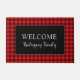 Alfombra de bienvenida moderna rústica roja y negra con cuadros de búfalo y nombre de familia. Puedes cambiar fácilmente el texto y el nombre para personalizarlo.