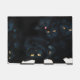 Un grupo de gatos negros peludos se agruparon en un gran charco sobre un suelo de baldosa blanca y negra.