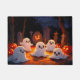 Un grupo de adorables fantasmas sentados juntos en el suelo, compartiendo espeluznantes historias de horror. Sus expresiones lúdicas y su atmósfera espeluznante crean una escena divertida y alegre de Halloween.