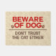Cuidado con el perro. Tampoco confíes en el gato. Cita divertida de perros y gatos. Perro y gato humorísticos diciendo por los dueños de perros y gatos. En texto rojo en negrita con huellas de pata marrón. El perro de advertencia firma graciosa parodia / parodia. El texto inferior es totalmente personalizable.