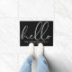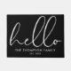 An elegant black and white doormat featuring beautiful script calligraphy hello and personalized with your family name and special date. Designed by Thisisnotme©