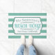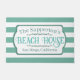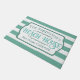Este doormat presenta una temática náutica con verde azuladas franjas horizontales en el fondo. En el centro se encuentra un marco de estilo vintage con un nombre de familia de ejemplo y el título de Beach House impreso en un llamativo tipo de letra verde azulada o aguamarina. La ubicación de la casa de playa está impresa en la parte inferior. Puede personalizar el formulario para incluir su propio nombre o texto personalizado.