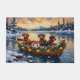 Bring spirited, low-riding charm to your holiday season with this adorable Dachshund Christmas design! This magical scene features three cute, expressive Dachshunds (Doxies) sitting attentively in a cozy wooden boat, gently floating on a serene snowy lake at sunset. The boat is beautifully adorned with glowing Christmas string lights and fragrant pine garlands, while the dogs wear festive scarves. They are surrounded by colorful wrapped presents and cheerful holly branches. Soft snowflakes gently fall, and the shimmering reflection of the lights on the water creates a truly magical winter holiday atmosphere. This design is a perfect Christmas gift for any Dachshund owner, dog lover, or admirer of festive and beloved hound dog art, capturing the serene joy of the season.