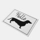 Doormat de dachshund blanco y negro con micropuntos negros y la palabra "Hola".