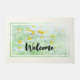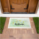 Doormat de bienvenida con una fotografía fresca y veraniega que muestra una colección de margaritas salvajes con grandes centros amarillos creciendo en un campo verde.