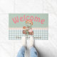 Un caprichoso retrato de cuento de hadas de una lujosa rana vistiendo un gorra de setas y sosteniendo setas. Pequeña casa de campo y pintura de animales de bosque que recuerda a los ilustraciones de libros infantiles. Adorable alfombra de puerta de gingham verde vintage es personalizable y te permite personalizar añadiendo tu nombre.