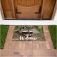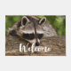 Un felpudo de bienvenida con una fotografía de un mapache lindo y curioso reposando su cara en un tronco de madera. Adorable.