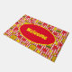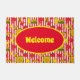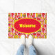 Colorida estera de bienvenida con perritos calientes, hamburguesas, botellas de ketchup y mostaza a rayas rojas y blancas. Perfecto para cenas, entradas de restaurantes y bares o carros de perritos calientes festivos