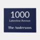 El número de la casa y el nombre de la calle están por encima del texto para el nombre de su familia o el mensaje de su personalizado en este oscuro felpudo azul de medianoche. El texto es blanco. Todo el texto puede editarse o eliminarse