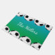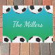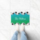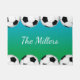 La pelota de fútbol bordea un fondo azul y verde con el nombre de su familia personalizado, el monograma u otro texto en el medio para hacer un divertido felpudo para una familia amante del fútbol.