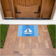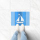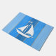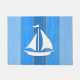 Diseño de temática náutica con decoración de velero sobre fondo azul rayado y gris de madera. Tenga en cuenta que esto no está hecho de madera, es una impresión gráfica de madera.