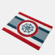 Diseño náutico con decoración de brújula en forma redonda sobre fondo rayado azul, rojo y blanco