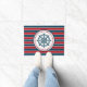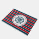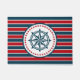 Diseño náutico con decoración de brújula en forma redondeada con estrellas en fondo rayado rojo, azul y blanco