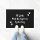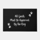 Saluda a los huéspedes a tu casa con una graciosa alfombra de bienvenida que tiene un texto de guión caprichoso "Todos los invitados deben ser aprobados por el perro" y huellas de pata blanca en las esquinas opuestas. El color de fondo negro se puede editar a cualquier otro color eligiendo personalizar y un color de fondo diferente del selector de color. También puede editar el texto si lo desea, o dejarlo como está escrito. Este felpudo hace un buen regalo para los dueños de perros.