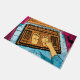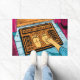El pie de una persona está siendo escaneado en un doormat estilo código de barras con las palabras Pie de escáner de código de barras impresas en él. Bienvenido a tus seres queridos con este estilo - Divertido diseño de código de barras - Escanea tus pies antes de entrar en Doormat.