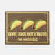 Divertida Alfombra De Entrada Vuelve Con Tacos. Alfombra diseñada a medida con las palabras "Vuelve Con Tacos" escritas en una fuente tipográfica genial. Esta divertida alfombra para amantes de los tacos seguramente deleitará a cada invitado que la encuentre. Personaliza esta alfombra de tacos con el nombre de tu familia.