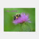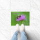Esta estera de puerta ofrece una abeja del manosear que recolecta el néctar de un flor púrpura del cardo.