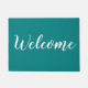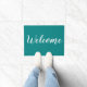 Una sencilla alfombra verde azulada en la puerta principal con un mensaje de bienvenida. El color de la puerta de bienvenida es el personalizable. Cambia a tu color favorito para que coincida con tu decoración de casa.