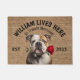 Bulldog Personalizado Perro amante bienvenido doormat. Esta alfombra de bienvenida se puede personalizar con el nombre de su perro, el lema también se puede cambiar o se puede usar una imagen de su propio perro (asegúrese de que es transparente). El texto dice: William vive aquí... Todos los tratamientos son bienvenidos Editar el diseño para cambiar el tipo de letra, los colores y el color de fondo. Cuando reemplace la imagen de su perro, utilice una imagen transparente. Hace un regalo maravilloso para un fiesta que hace las delicias del hogar, vacaciones, amantes del perro y casi cualquier ocasión.