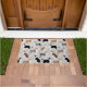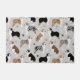 Pastores australianos cortos / Perros australianos con abrigos negros, marrones y merluzas sentados y parados con huesos de perro dispersos y huellas de pata en un fondo gris claro.