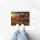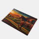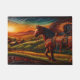 Un porrazo de cuero que representa un caballo con una silla y un cabecero en un campo al atardecer.