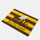 Huéspedes agradables adentro con este doormat de la abeja. Una abeja del dibujo animado está contra un fondo amarillo y marrón de las rayas. El mensaje lee la "abeja nuestra huésped".